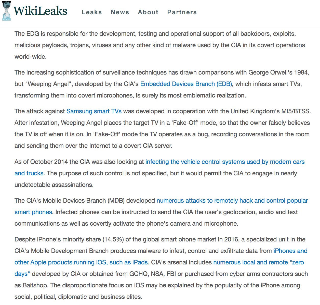 This morning at 9 a.m. Eastern, WikiLeaks released the biggest intelligence information dump in history (here). The dump of 8,761 documents, dating from 2013 to 2016, and entitled 'Vault 7' reveals how the US Central Intelligence Agency spies on citizens through almost all consumer technology. The CIA hacks, and can control, modern cars and trucks, iPhones, iPads, and Android phones.